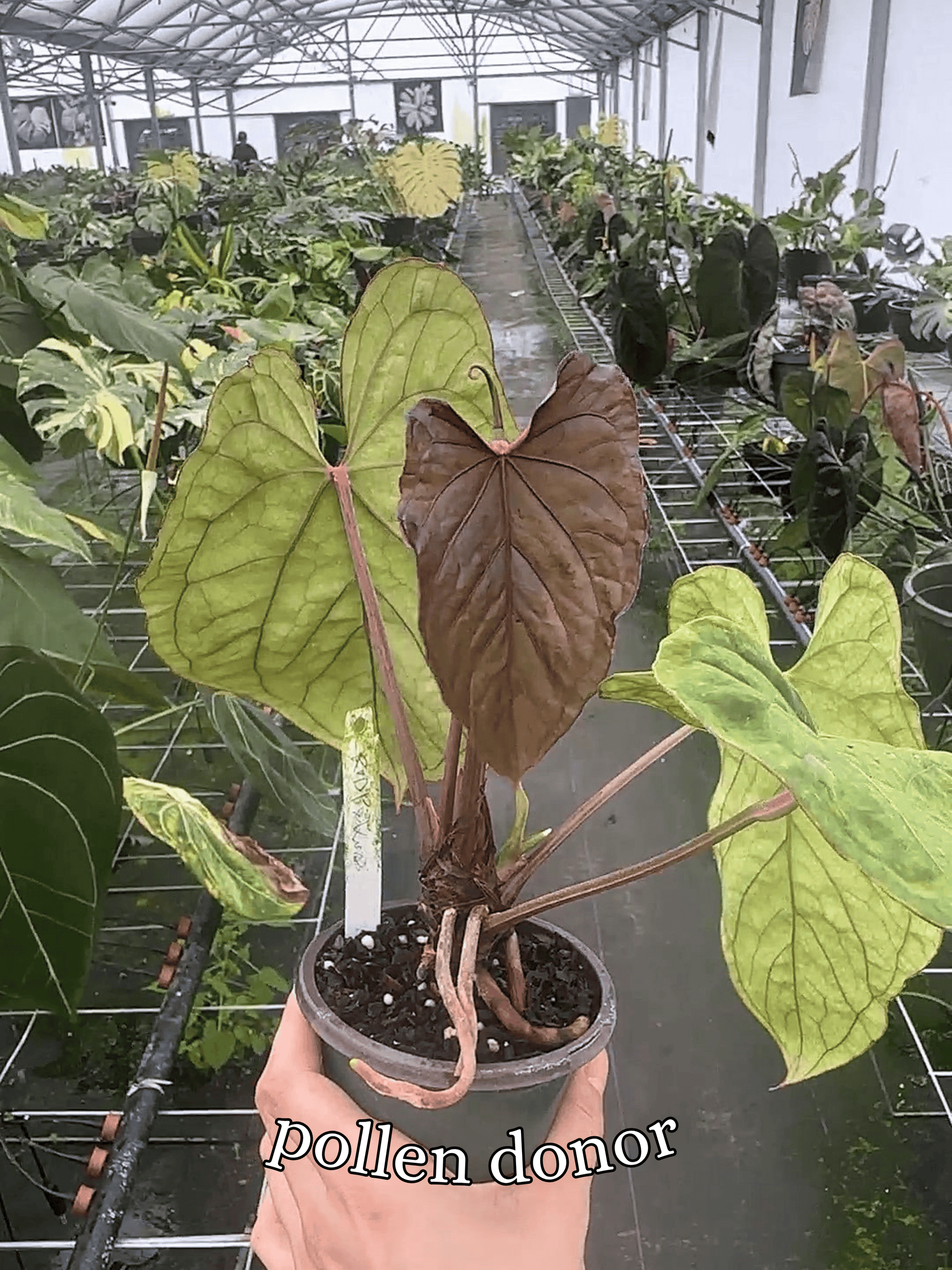 The pollen donor is Anthurium RVDP x Kunayalense which I purchased from SKG through a reseller on PalmStreet. The plant arrived in very sad condition, but had a flower which i was able to collect pollen from to make this hybrid. It never recovered and lost all its leaves before I could take parent photos. The photos shown are from the listing when I purchased it originally. It did show signs of variegation, however it was very minimal and unlikely to be passed on.