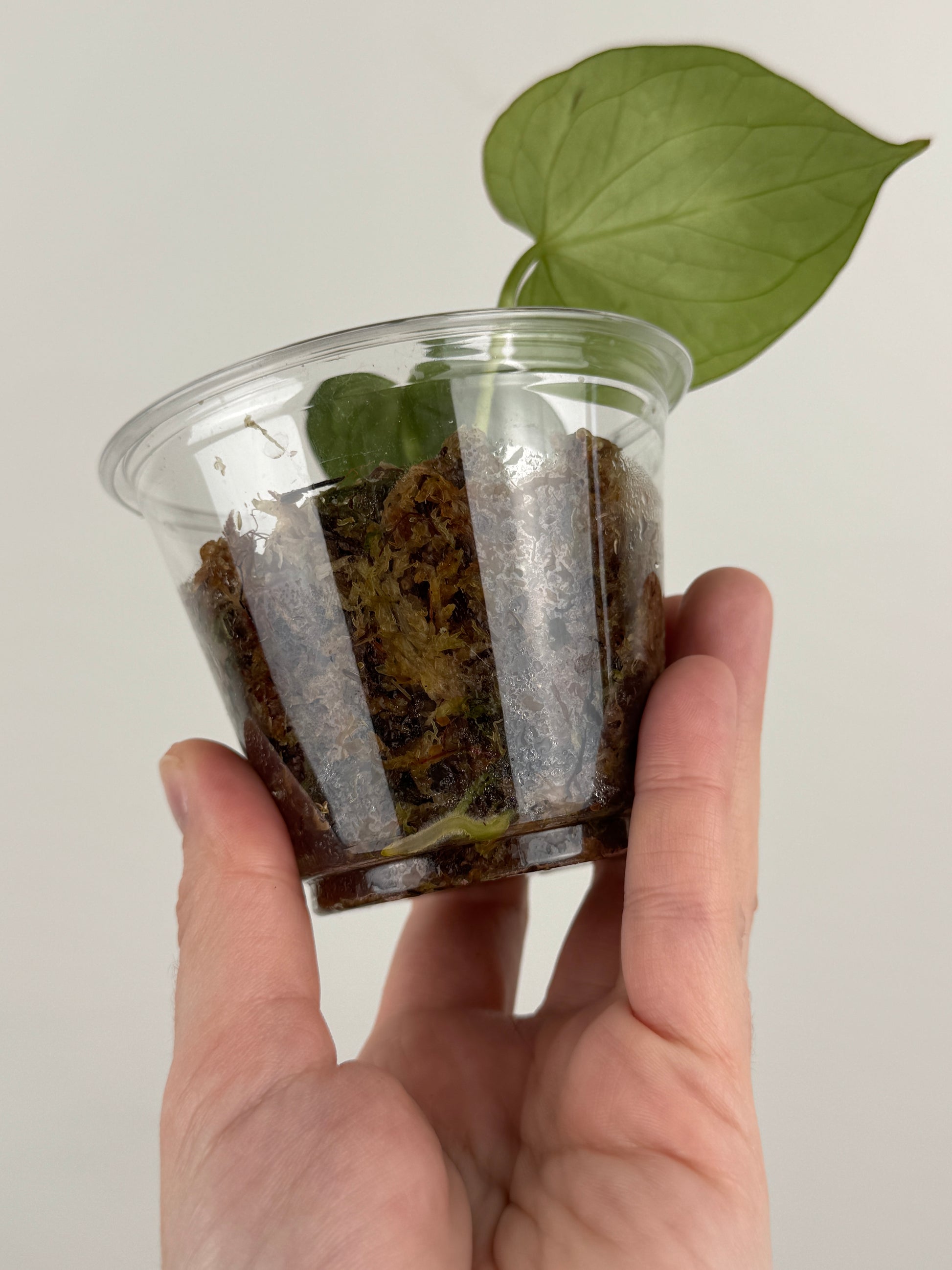 Rooted in sphagnum moss in plastic cup.