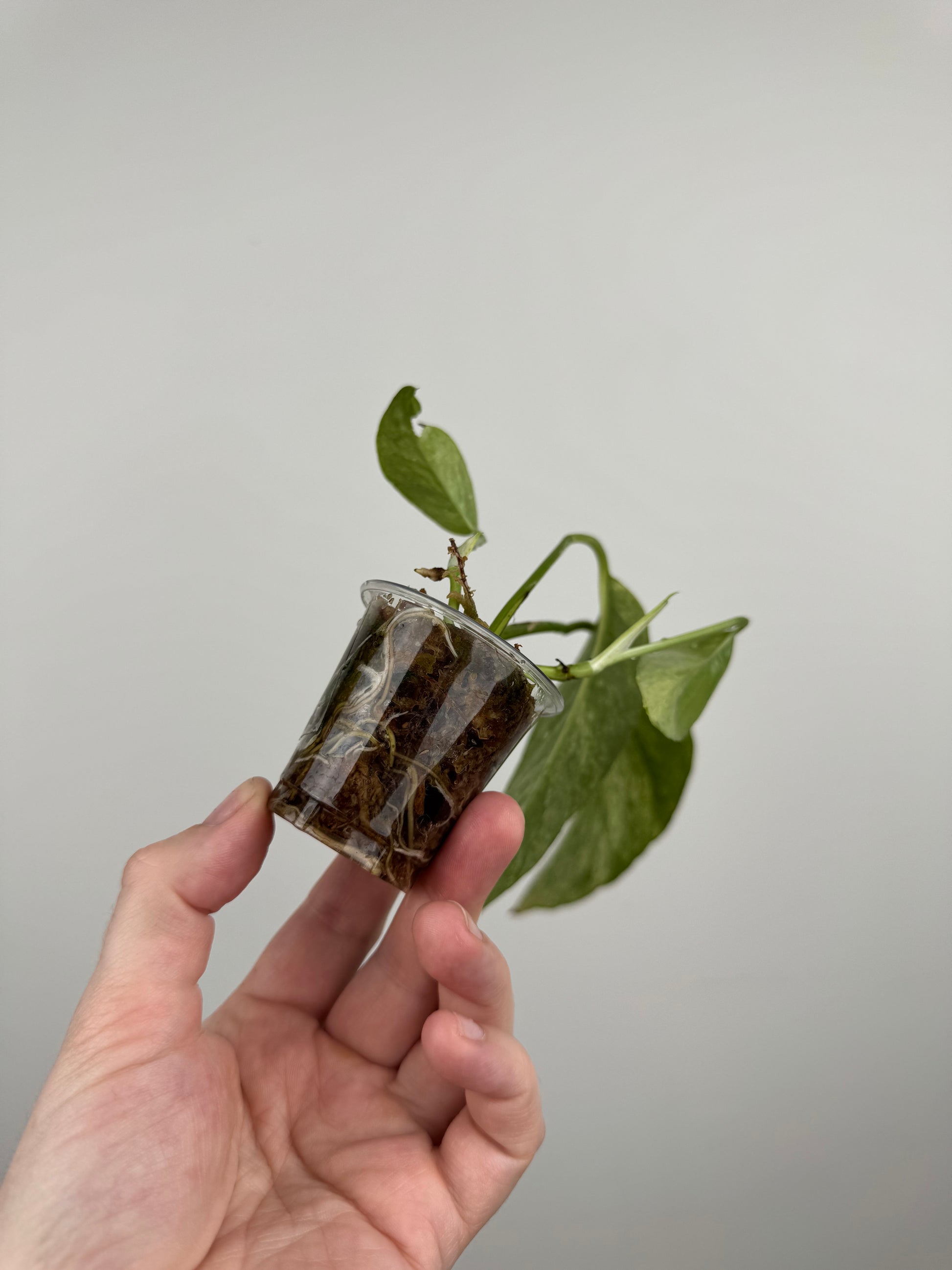 Two rooted cuttings grown in sphagnum moss in 2 OZ plastic cup.