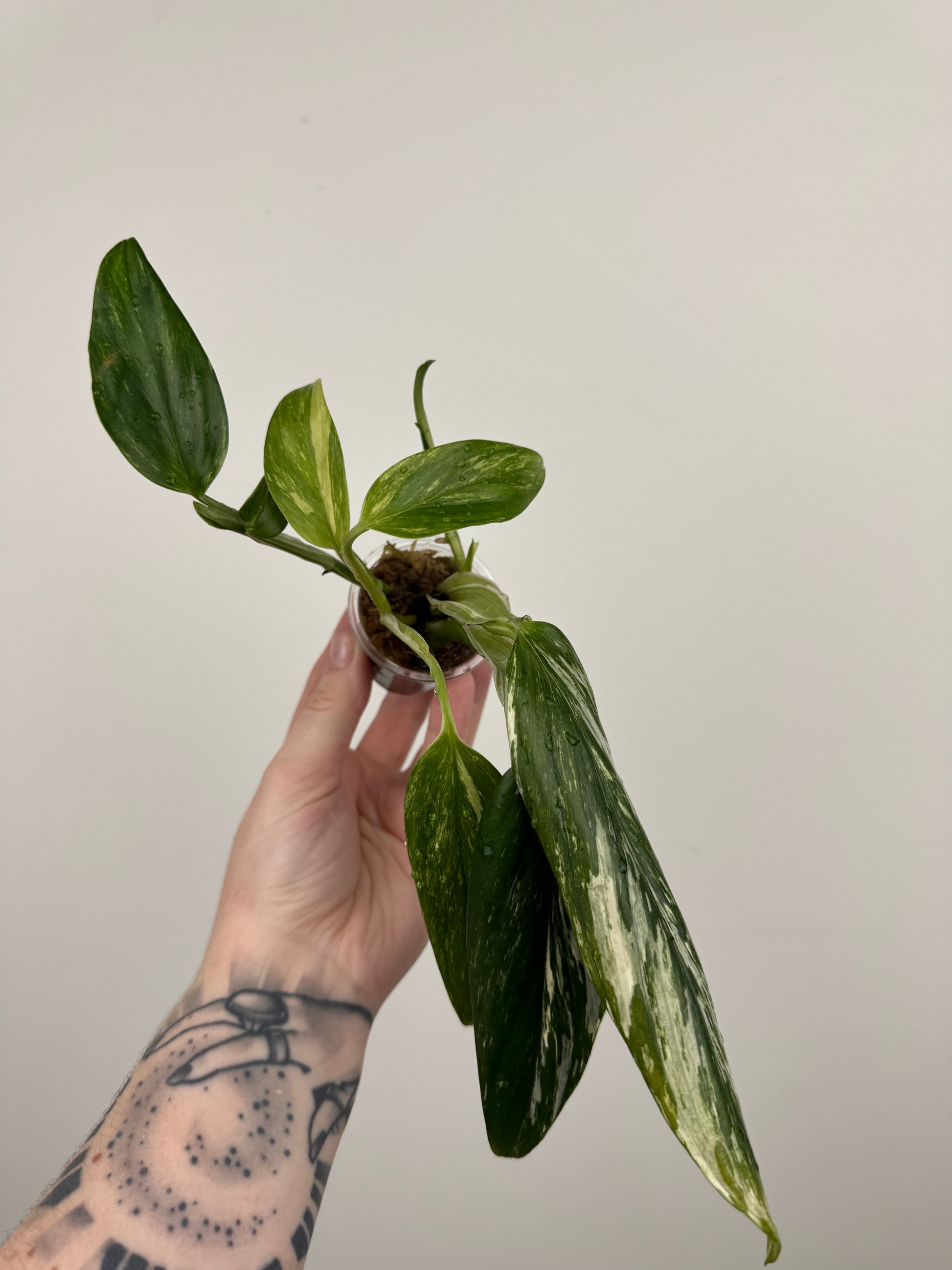 Three rooted cuttings grown in sphagnum moss in 2 OZ plastic cup.